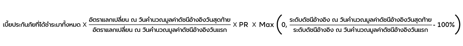 - อัตราการมีส่วนร่วมในเงินปันผล (PR) หมายถึง อัตราที่ให้ผู้เอาประกันภัยมีส่วนร่วมในผลตอบแทนที่เกิดจากการเปลี่ยนแปลงในเชิงบวกของ ระดับดัชนี จากมูลค่า ณ วันคำนวณมูลค่าดัชนีอ้างอิงวันแรก ซึ่งสำหรับแบบประกันนี้ จะใช้อัตราการมีส่วนร่วมในเงินปันผลเท่ากับ 50%